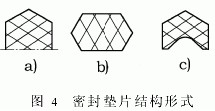 密封垫片的结构形式也有很多种,其截面形式大致有矩形、梯形、六边形、五边形等。常用的形式有两大类型:一种形式如图4a所示,其密封垫片横截面的上部为尖形的;另一种形式如图4b所示,其上部为平面。前者是通过顶端至中部的尺寸差来增加密封垫片的变形程度,其结构设计实际上仍然是平面密封,而非线性密封,因为板片的密封槽底部是平面,当板片密封槽底部平面有缺陷时,这种结构能抵消一些。后者设计的目的是为了减少密封垫片的压缩量,其压紧形式为平面压紧。其主要缺点是在板片装配过程中,板片容易错位,夹紧力过大,容易造成板片变形等。通过分析研究和试验,本文设计出与图3b所.示密封槽相对应的垫片截面如图4c所示,使装配更加简单,也提高了板片的承压能力。